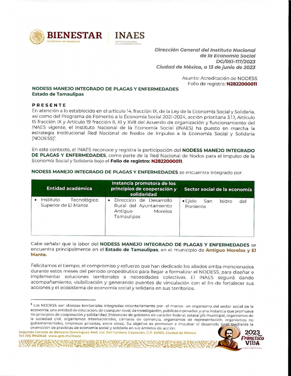 Nos enorgullece informar que el Nodo de Manejo Integrado de Plagas y Enfermedades ha sido reconocido y registrado por el INAES, formando parte de la red nacional de nodos para el impulso de la economía social y solidaria. El folio de registro asignado es N2822000011, un testimonio de nuestro compromiso y dedicación.