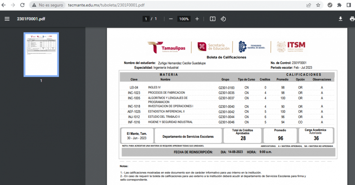 4.- A continuación se mostrará tu boleta de calificaciones (puedes descargarla en formato PDF o imprimirla).